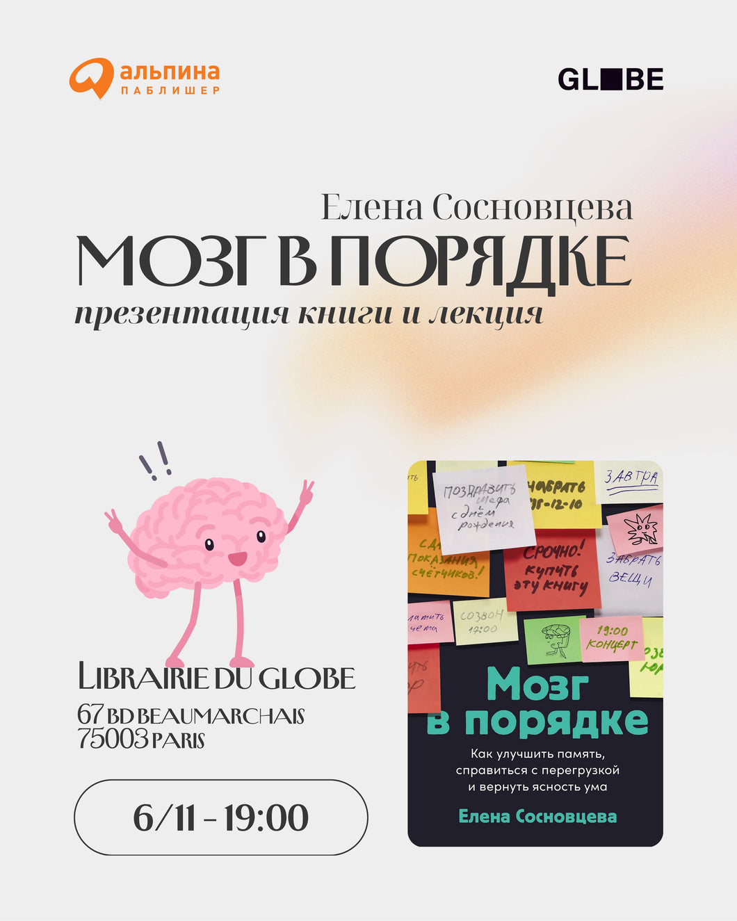 Le 6 novembre à 19h, à la Librairie GLOBE, —la rencontre avec Elena Sosnovtseva, experte en développement cognitif, autrice de programmes éducatifs et du livre « Le cerveau en ordre », consacré aux secrets du fonctionnement de notre matière grise.