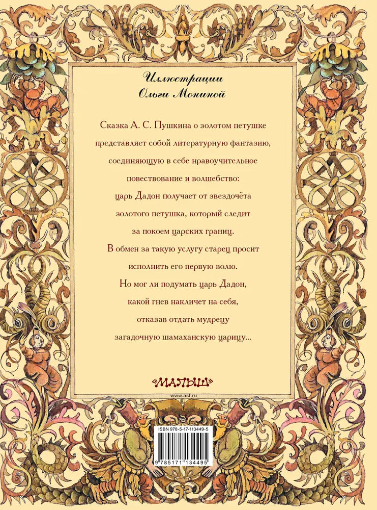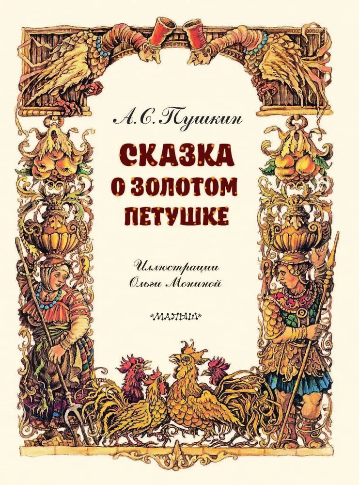 Сказка о золотом петушке" впервые была напечатана в 1835 году и несколько строк сразу же попали под цензуру и были заменены многоточиями. Сейчас каждый взрослый и ребёнок имеют возможность познакомиться с текстом сказки в её первоначальном виде. Шамаханская царица, звездочёт, золотой петушок — прототипы этих персонажей взяты из древнего фольклора. Но всем эта сказка знакома по сюжету, который мы слышали от наших родителей, бабушек и дедушек, узнавали из книг: царь Дадон, заполучив золотого петушка, отказывает мудрецу исполнить его первую волю — отдать шамаханскую царицу... Познакомьте юного читателя с неустаревающей классикой — "Сказкой о золотом петушке"! Иллюстрации нарисовала Ольга Монина — обладатель медали Московского союза художников "За заслуги в развитии изобразительного искусства". Для детей до 3-х лет.