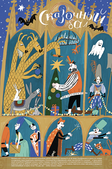 Адвент-календарь перенесёт вас в средневековый замок, в котором обитают драконы, принцы и принцессы, весёлые кабанчики и под потолком летают феи-крёстные. А ещё там живёт очень рассеянный волшебник, случайно уронивший волшебную палочку. И все вещи, которые находились в руках, на головах и в карманах своих владельцев, перемешались. Спасение новогоднего бала в руках обладателя адвент-календаря!